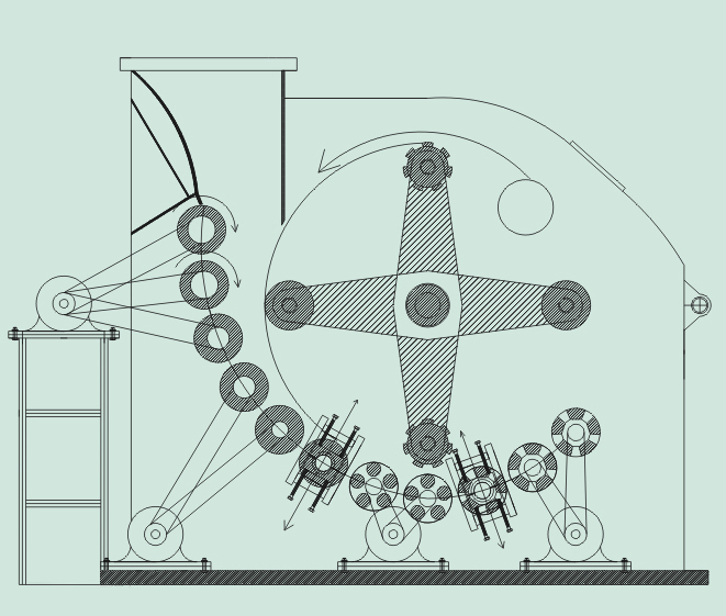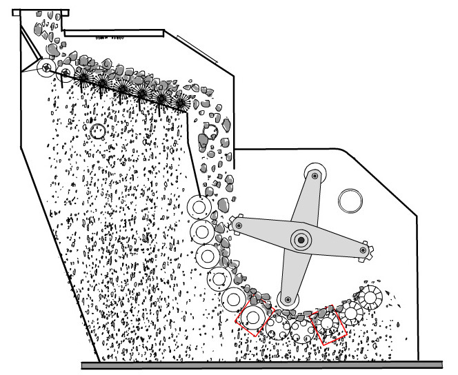 破碎物料進入粗破的形式,由粗輥與反擊板相互刮削打擊運動使大塊物料破碎,然后進入篩分系統達到粒度要求的直接送進鍋爐,未過到要求粒度的再進行到細破置進行破碎,兩細破輥子相對差速運轉,具有相互刮削作用而強制排料,采用原料自由落差,全進全出,對物料水分無任何要求。