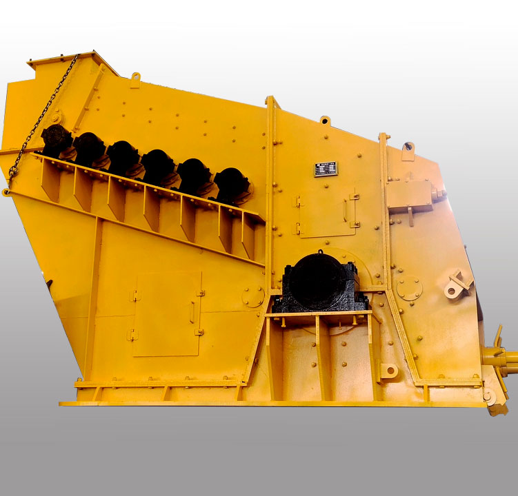 篩分破碎機采用三臺交流電動機分別帶動粗、細破齒輥相向轉動。物料由入料口進入破碎機后,首先受到高速旋轉的粗破齒輥與反擊板的劈破、折破、擊破等多種組合破碎,粗破后,直接落入篩分腔進行篩分,符合粒度要求的,則進入細碎腔進行破碎,使其達到所需粒度要求。